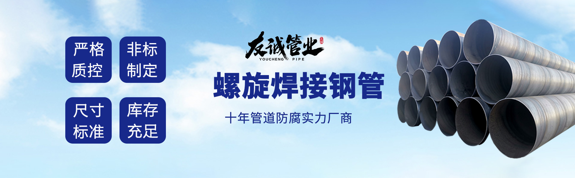 滄州友誠管業(yè)有限公司是一家專業(yè)從事生產(chǎn)防腐涂塑管道及管件于一體的大型企業(yè)。公司注冊資金8600萬元,位于中國管道生產(chǎn)基地—河北鹽山縣,近靠京滬高速、榮烏高速、黃石高速30公里,高鐵滄州西站40公里,天津國際機(jī)場、濟(jì)南遙墻機(jī)場150公里,為客戶來訪及業(yè)務(wù)發(fā)展提供了便利的交通條件。        鋼管系列:螺旋鋼管、無縫鋼管、ERW直縫焊管、JCOE埋弧焊直縫鋼管、熱鍍鋅鋼管。        涂塑系列:內(nèi)外涂塑鋼管、涂塑復(fù)合鋼…… 了解更多